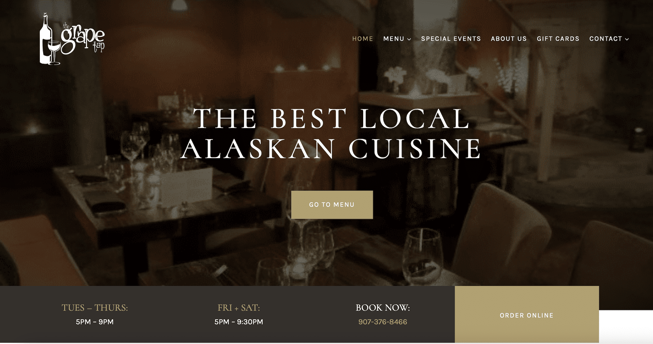 The Grape Tap partnered with us to create a refined digital home that reflects the restaurant’s warm, intimate dining experience. The custom website highlights seasonal menus, a curated wine selection, and upcoming events. Designed with elegance and functionality in mind, the site captures the heart of The Grape Tap: exceptional food, fine wine, and authentic Alaskan hospitality.